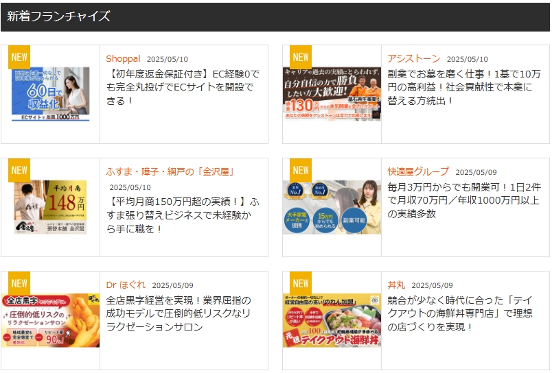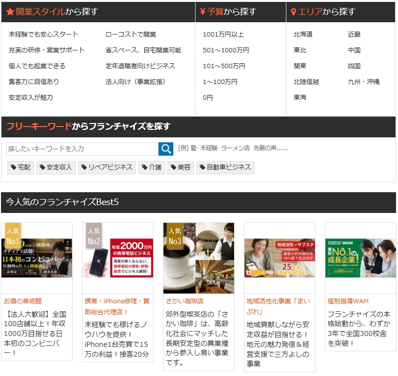 といった形で、自分の希望条件に合うフランチャイズをピンポイントで探すことができます。